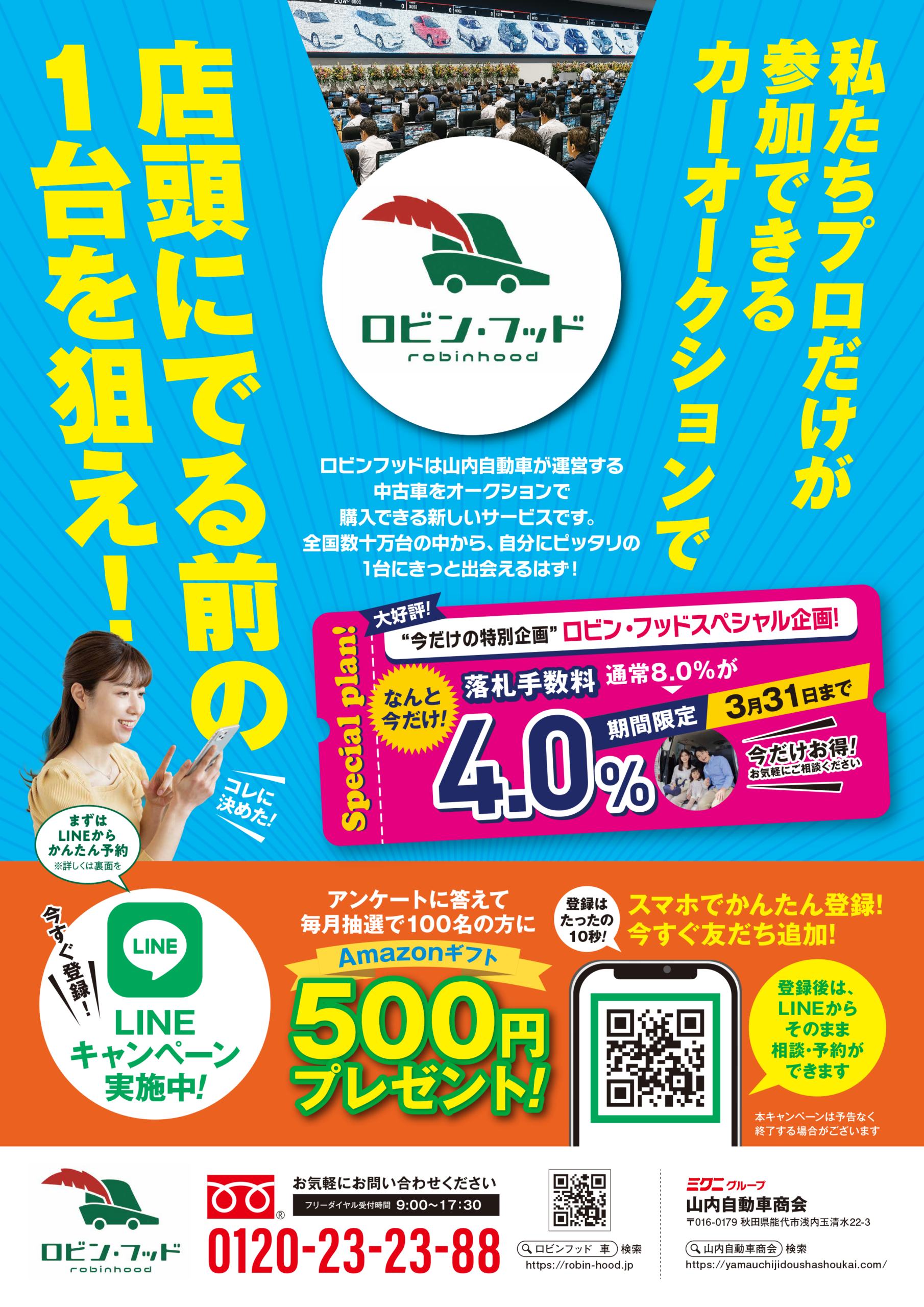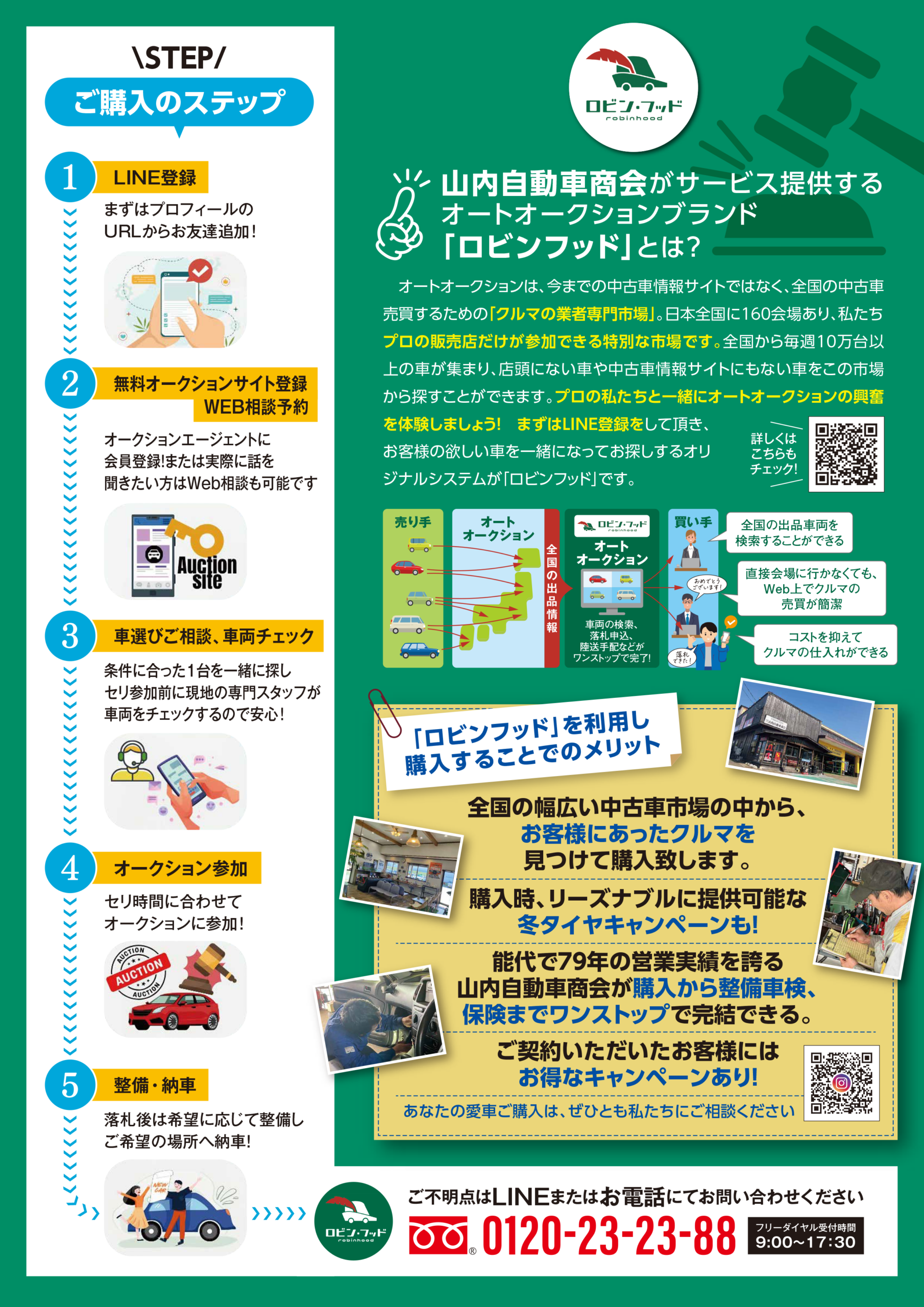 能代市で79年の営業実績を誇る「山内自動車商会」が運営するオークション体験型サービスが「ロビン・フッド」。そのため、購入後のサポートも万全です!