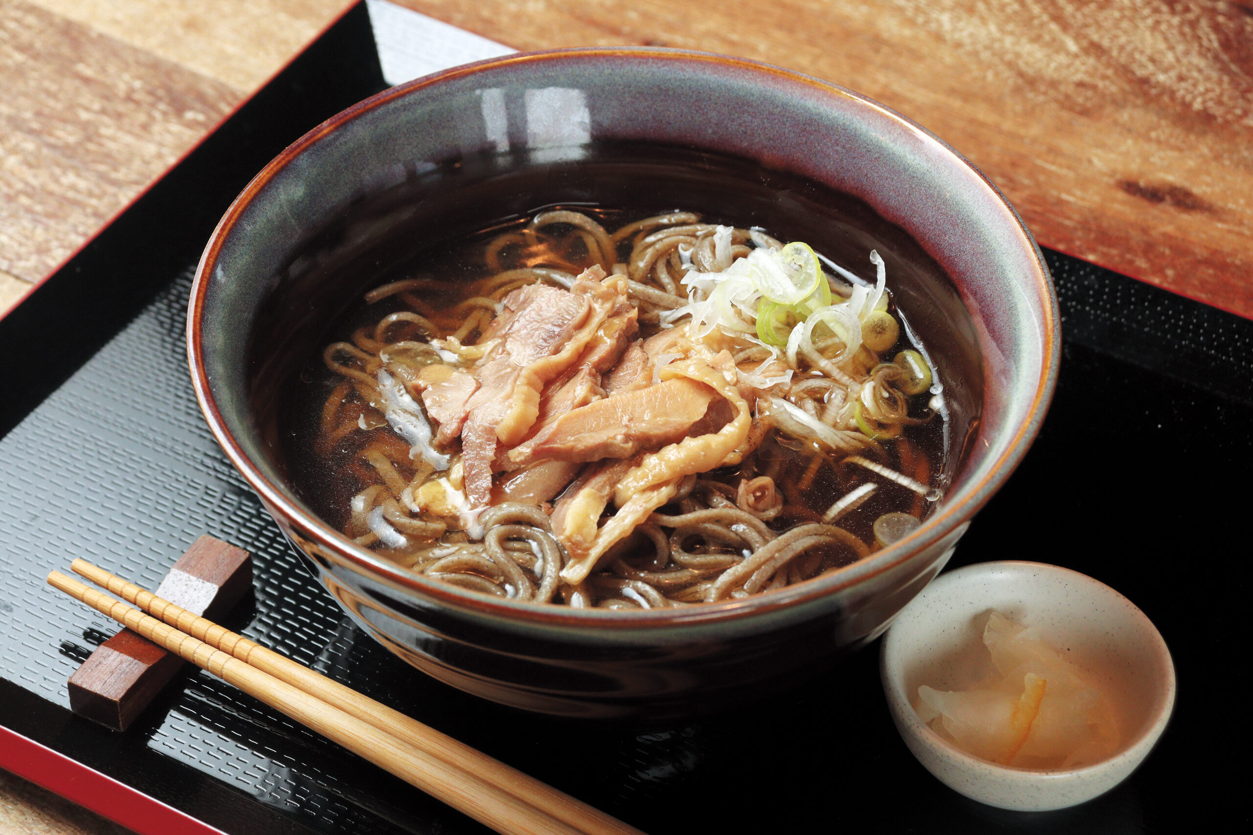 (トップ)「冷たい肉蕎麦」1,200円。粗挽きの全粒粉を使った太めの蕎麦は香りと噛み応えがあり、カツオ節や親鶏のダシが効いたつゆとよく合う。