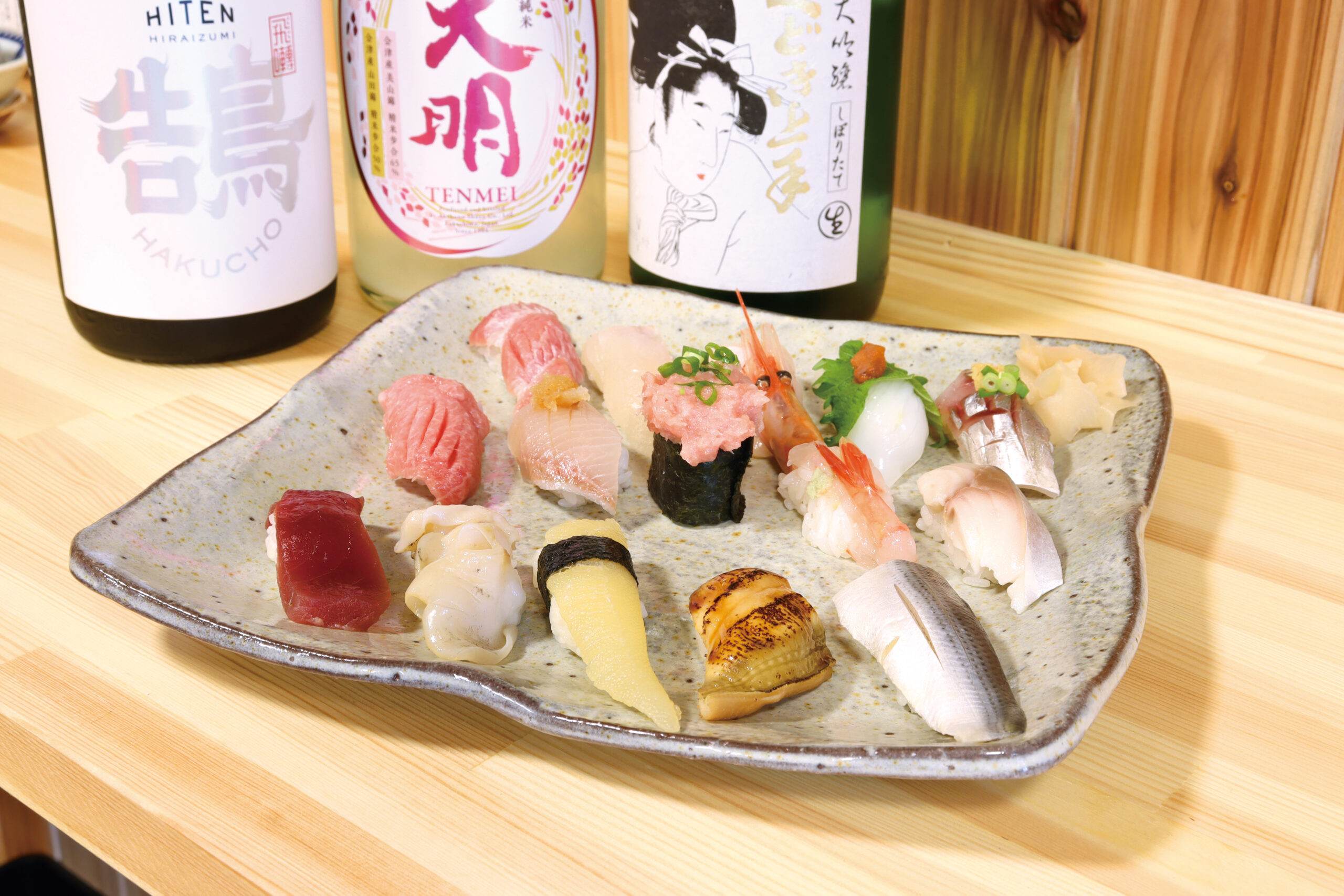 (トップ)「店主のお任せ握り15カン」5,500円。取材時はマグロやエビ、イカなど新鮮なネタが並んだ。県内や山形県などの日本酒が種類豊富なので、合わせて愉しんで。